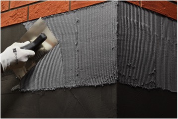 Stap 2: Breng Izoflex-SK lijm “nat in nat” aan met een getande spaan (afmeting tanden: 4/4 mm). Houd bij normale weersomstandig heden maximaal 4 rijen steenstrips aan. Het oppervlak dat door de lijm wordt bedekt bij warm weer worden verkleind tot 2 of 3 rijen steenstrips. De lijm moet voordat de steenstrips worden aangebracht altijd plastisch en vochtig zijn. Als de lijm te snel droogt kan deze door middel van nevelen met leidingwater worden bevochtigd. |